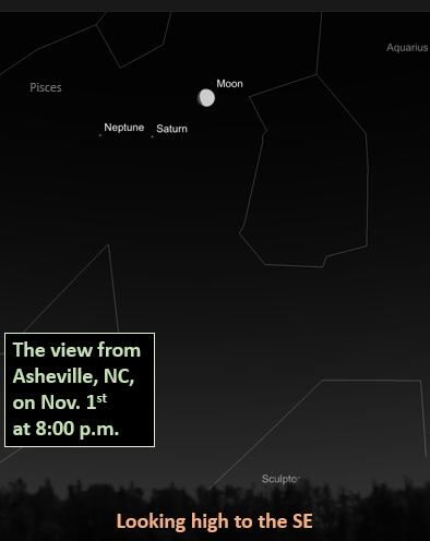 17 Oct. 2025 — Friday night — The location for this star gaze will be Lookout Observatory on the UNC Asheville campus, with a weather backup date of Saturday, 18 October. While the event is free and open to everyone, pre-registration is required to attend. To learn more about how to register, please visit the UNCA Lookout Observatory website here. Sunset occurs at 6:51 p.m., with shuttle service beginning about 7:30 p.m.